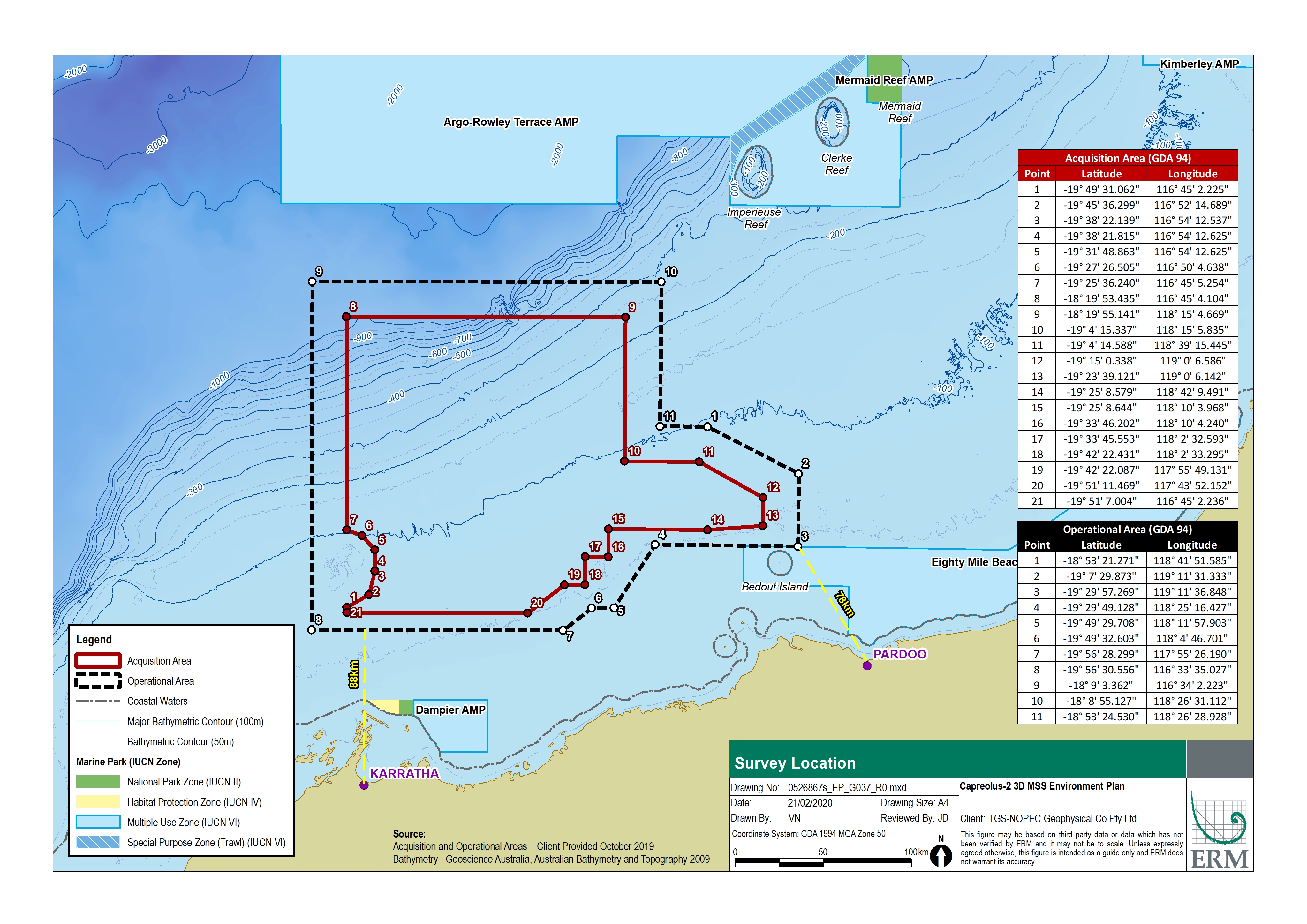 The Acquisition Area comprises the area within which 3D seismic acquisition will be undertaken and covers approximately 27,649 km2. The Acquisition Area is surrounded by a larger Operational Area (42,868 km2), for the purpose of line turns, run-ins, run-outs, seismic testing and support activities. The Operational Area at its closest is approximately 88 km north of Karratha and 78 km north-west of Pardoo. The seismic survey will be undertaken in water depths between approximately 50 m to 1,133 m.
