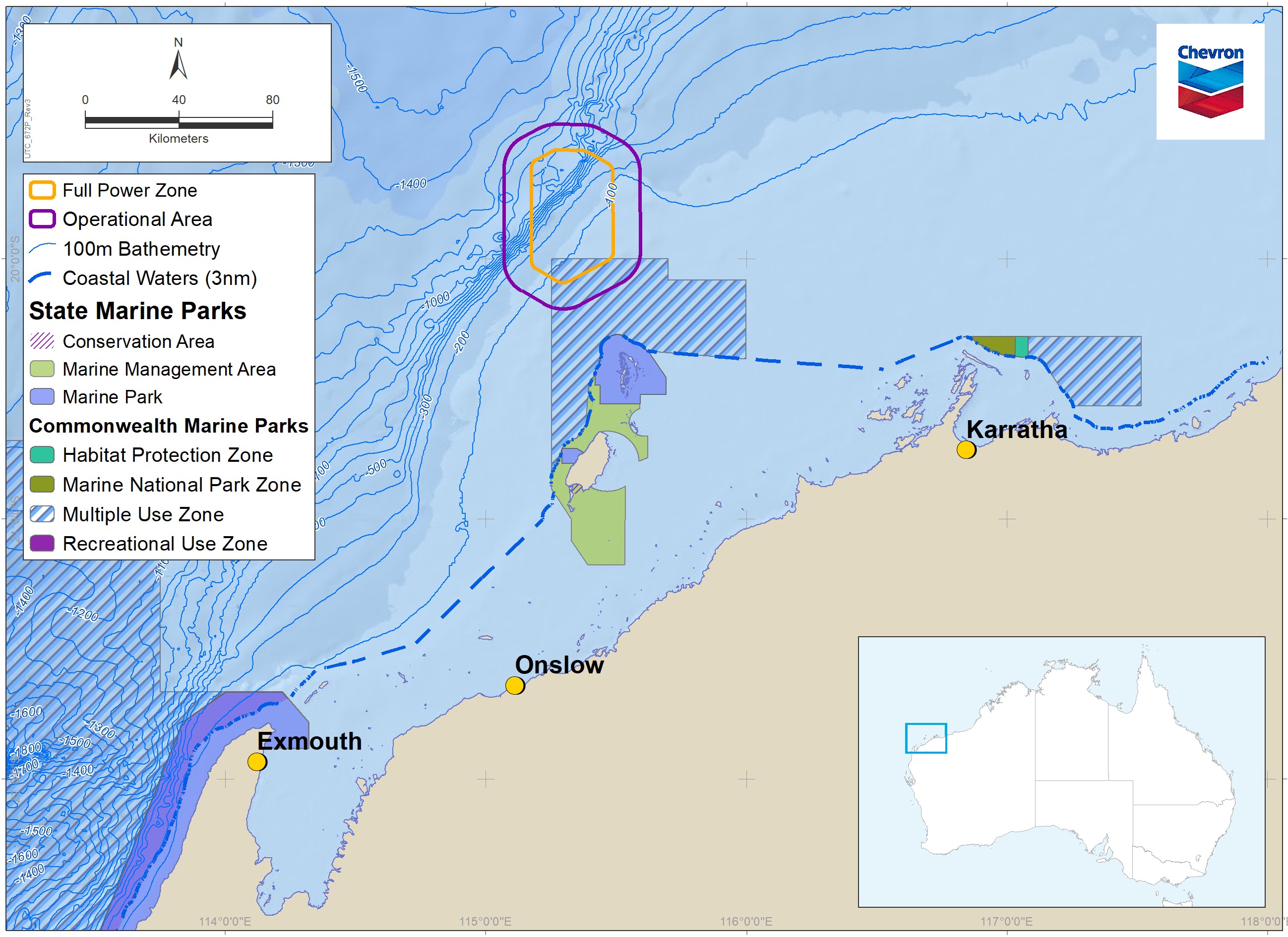 Chevron Australia Pty Ltd (CAPL) proposes to conduct a 4-dimensional (4D) marine seismic survey (MSS) over production licences WA-46-L, WA-47-L and WA-48-L in the Wheatstone and Iago gas fields in Commonwealth waters north of Barrow Island, Western Australia. The 4D MSS aims to repeat the acquisition of the 3-dimensional (3D) MSS conducted over the same area in 2011–2012, as part of a monitoring program. The 4D MSS is scheduled to occur between mid-December 2022 and mid-April 2023, subject to vessel availability, and is expected to take ~75 days to acquire. Seismic acquisition will be conducted 24 hours a day.