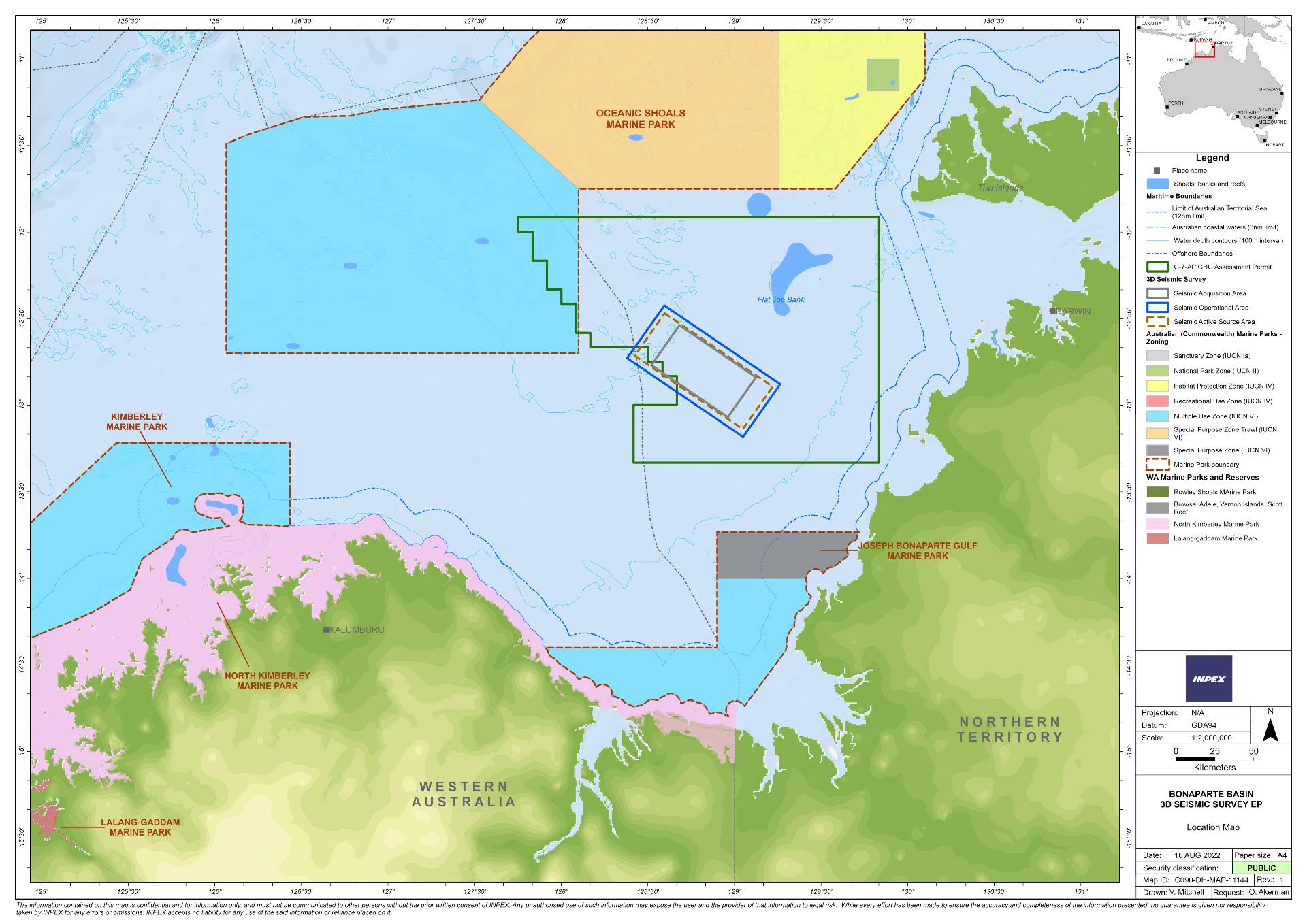 INPEX Browse E&P Pty Ltd on behalf of the Bonaparte Carbon Capture and Storage Assessment Joint Operating Agreement participants was successfully awarded GHG assessment permit G-7-AP, located offshore in the Bonaparte Basin off northern Australia. The G-7-AP permit area is wholly located within Commonwealth waters to the north of the Joseph Bonaparte Gulf and approximately 100 km west of Darwin Harbour. INPEX is proposing to undertake a three-dimensional (3D) marine seismic survey (MSS) within G-7-AP.